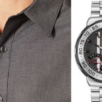 Keep watches simple for evening wear, no complicated chronographs. Having said that, rules are made to be broken. If the shirt is dark and plain you can get away with a more eye catching watch, and the grey dial of the TAG Heuer Formula 1 chrono does that perfectly. This easy to read chronograph watch is brilliantly designed and features a precise Electro-Mechanical chronograph and a stylish Christmas red striped dial design.