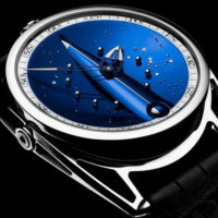 The dial is also encrusted with diamond and white gold stars. The watch’s hour markers are made from polished steel that almost look like they are floating in mid air. The dial is then surrounded by a minute circle, with the time being indicated by two mirror polished steel flamed blue hands.