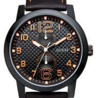 Guess remains one of the most fashionable and popular of the stylish retro brands. This watch has a black carbon coated dial with sub-dials at 12 and 6 o’clock and oversized orange numbers. This quartz watch comes on a black leather strap with orange stitch detailing. Water resistant to 100 metres. £183