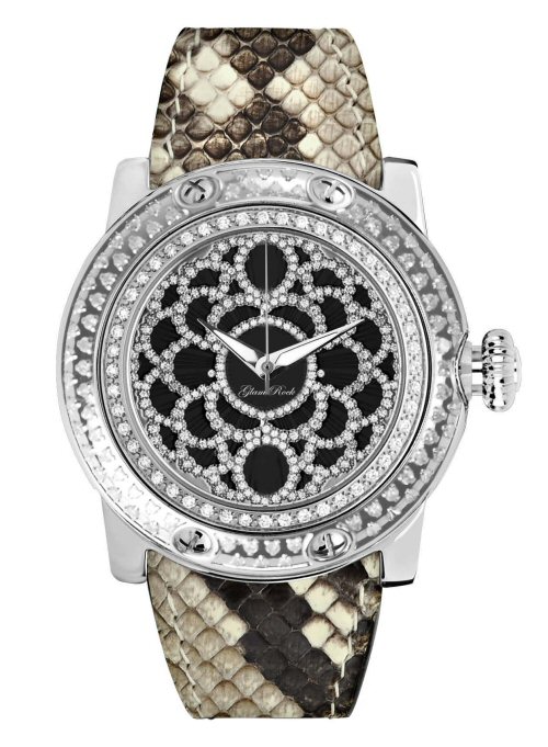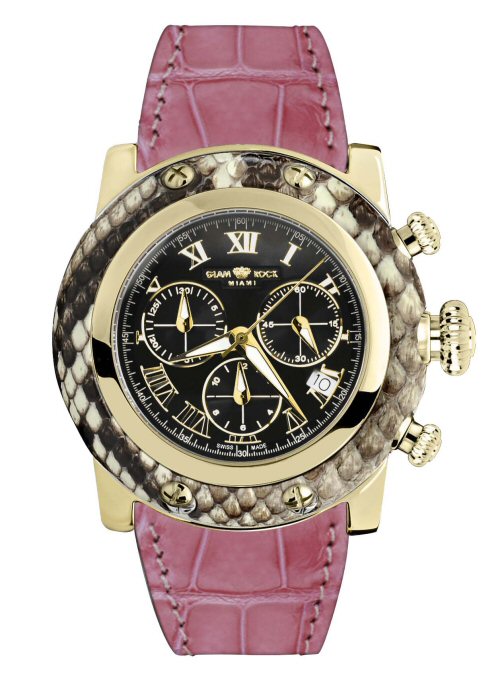 There are a couple of elements that make Glam Rock watches stand out from the bling-tastic competition, not least the fact that they can only be obtained from the world’s most prominent watch, jewellery and department stores. Finely handcrafted accessories are comprised of specially selected materials and leathers; interchangeable case covers – such as diamond studded, tachymeter, metallic, and sunburst – that protect the stainless steel case, and replaceable straps of genuine alligator, lizard and python skins. One basic watch model can take on another persona just by switching the components, which themselves have descriptive titles. It is no wonder then that key markets have been established in the USA, Asia and Middle East, with more and more aspiring fashionistas wanting a piece of the innovation and charisma that Glam Rock provides.