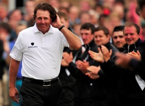 US golfer Phil Mickelson arrives to receive the Claret Jug after winning the 2013 British Open Golf Championship at Muirfield golf course at Gullane in Scotland on July 21, 2013. Mickelson won the British Open at Muirfield with a superb final round of 66. The 43-year-old American won with a three under total of 281, three strokes clear of Henrik Stenson who had a closing 70. AFP PHOTO/GLYN KIRK (Photo credit should read GLYN KIRK/AFP/Getty Images)