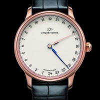 The red gold hand shows local time whereas the blued steel hand gives time in the wearer’s country of choice. By opting for the unconventional system of a single crown to adjust both hands, Jacquet Droz has succeeded in making the Grande Heure GMT simplicity itself.