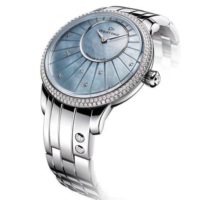 In order to portray such a vision, the watches façade has been divided up by an off centre, silver circle and splaying bands of ‘light’ in similar silver strips. The pattern depicts the sun; the off centre positioning of the emblem denotes that the sun is elevated in the sky implying the essence of daytime. The high quality mother-of-pearl is delicately worked and cut into a single disc in an array of light-catching hues that vary with the movement of the wrist: royal blue, ultramarine, cobalt or indigo.