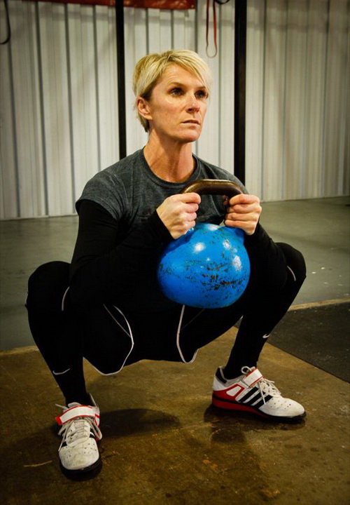The Kettlebell goblet squat is another great exercise for a beginner. Start by holding the Kettlebell by the horns (or handle) with your feet slightly less than shoulder width apart. Hold the bell close to your chest, keeping your back straight at all times. As you squat down, make sure you bring your elbows inside of your knees, lowering yourself as far down as you can. Keep back straight and torso upright, braced your abs and press back up.