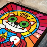 However, any introduction of a new medium of art will undoubtedly be met by critics and spectators that will attempt to draw metaphorical meaning from the works, and in some cases, take great offence. Dieme Rosser is a contributing artist (out of a total of 49 in the show) that has reproduced images of the devil as a cat in a comedic manner, making ‘Lucifer’, as he is referred to, seem altogether friendly. His main exhibition piece is entitled Hail Lucifer and consists of a brightly coloured mono print version of a cartoonised kitten with a yellow and blue halo that projects varying shades of pink. He wears a golden crown perhaps denoting religious power, potentially symbolising the son of God. The twist to the image however, is that as the eye progresses down the feline’s body, a symbol of a smiling heart with a cross resting in its surface appears to be on fire. On closer inspection, the detail of the additional cross appears more sinister than at first glance. The emblem is piercing the creature’s heart in a sacrilegious way.