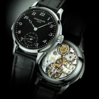 DeWitt Concept Watch No. 3 – X-Watch. A unique reversible, titanium and steel automatic wristwatch with double bi-retrograde hours and minutes, visible one-minute tourbillon and power reserve on the front side, chronograph on the reverse. This timepiece brought in €410,000. ($550k).