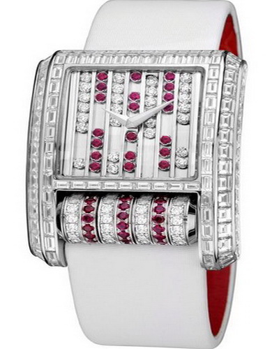 The watch is driven by an E01.701 quartz movement and is completed by a white satin strap that is fastened by an 18k white gold buckle that includes 178 diamonds, totaling 1.51 carats.