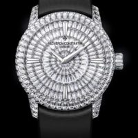 The high jewellery collection from Patrimony Traditionnelle is truly something spectacular to behold. The watches 35mm diameter and 40mm dial are fully paved with 16.2-carat claw-set baguette diamonds. Even the white gold case, dial and clasp are fully encrusted with diamonds so that not even a speck of light can penetrate the layer of precious stones. The round-cut diamonds spiral outwards via the centre of the face; each ring increasing in diameter until there is no gold left visible. The functionality of the watch; the mechanical manual-winding movement (calibre 1400), can be proven through the clear sapphire-crystal case back that allows viewers to observe the timepieces inner workings which have been hand finished to add true authenticity to the piece.
